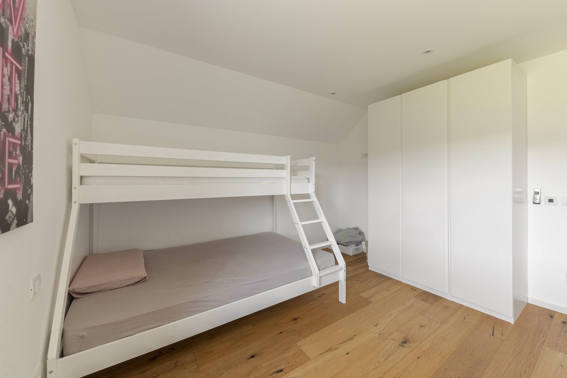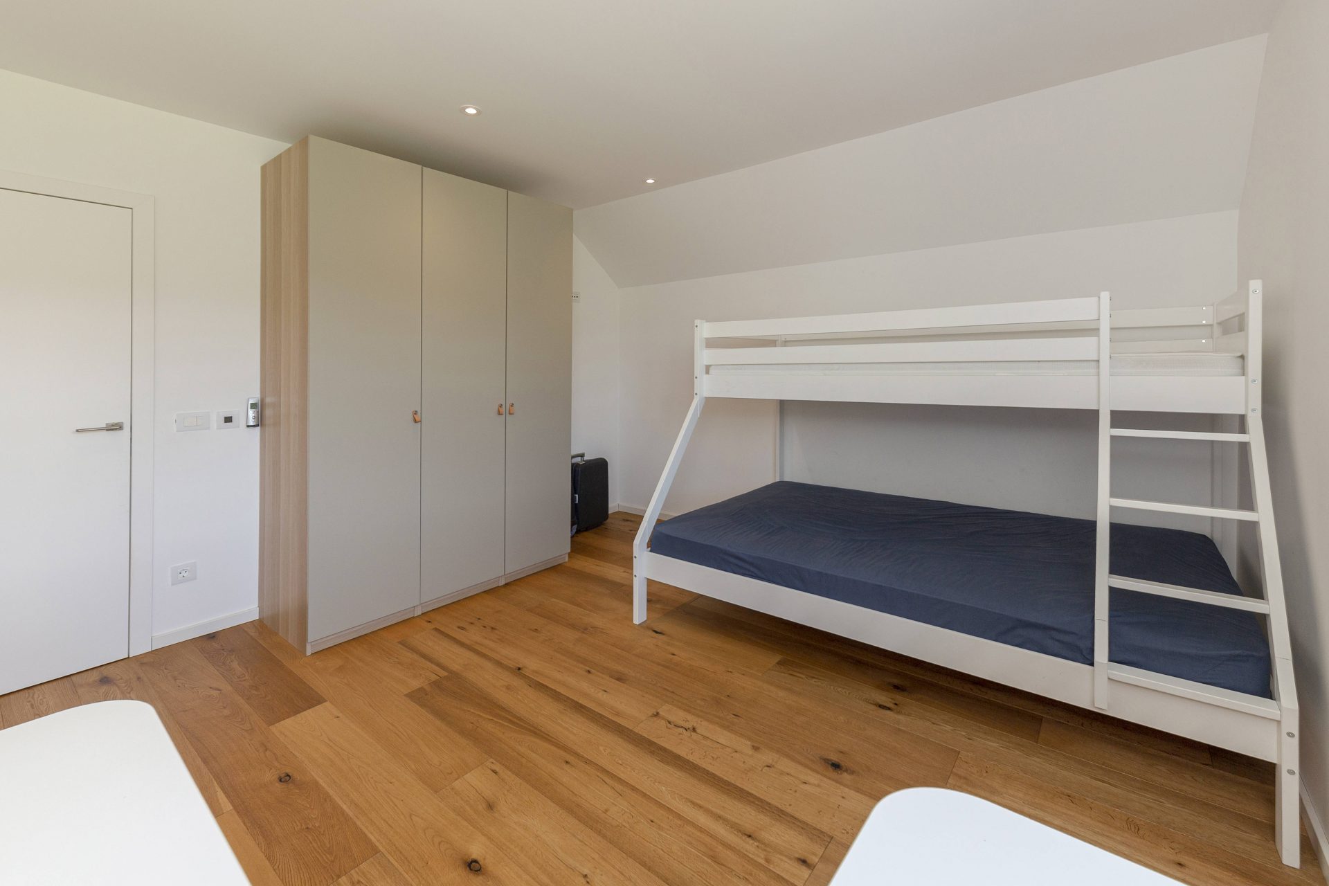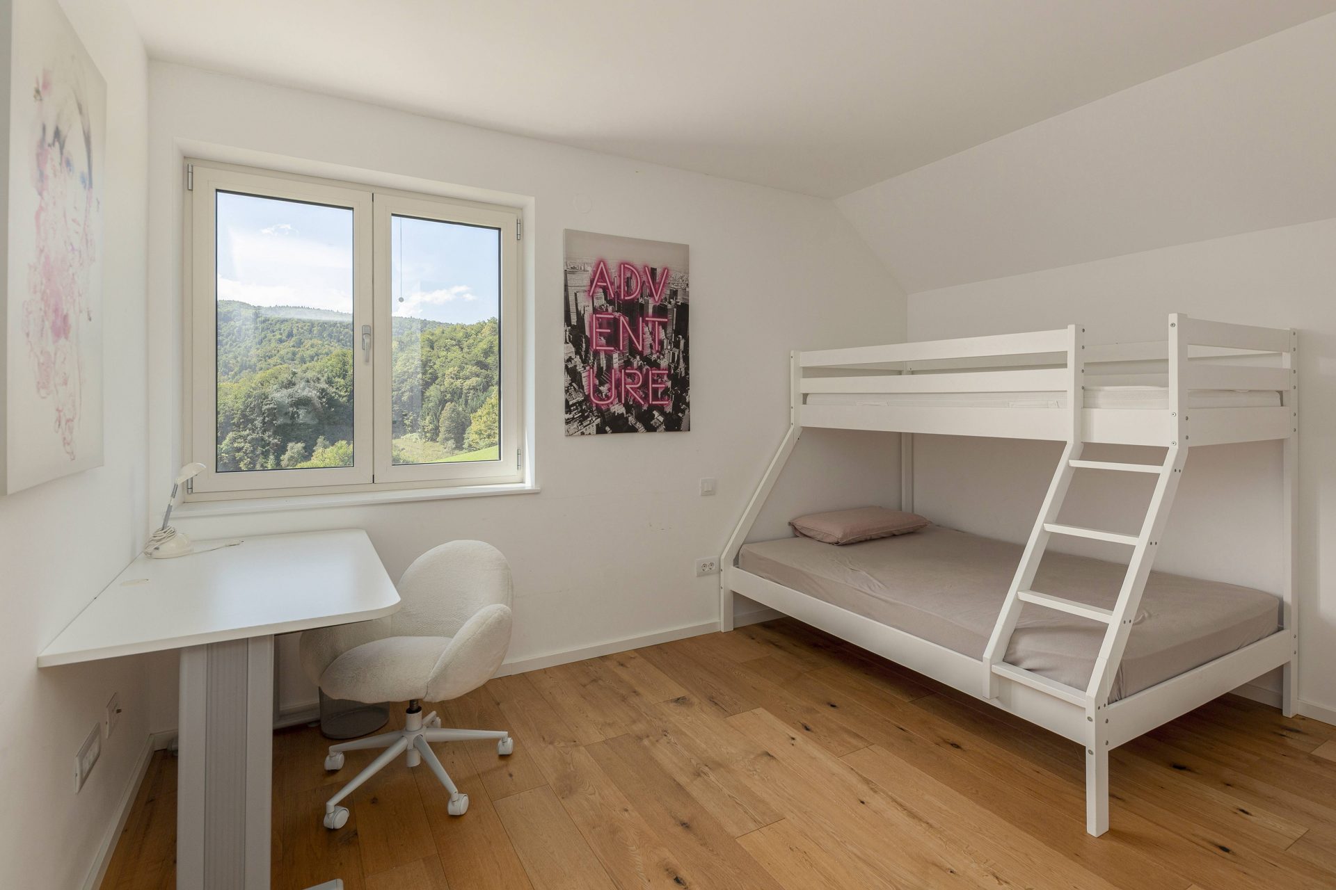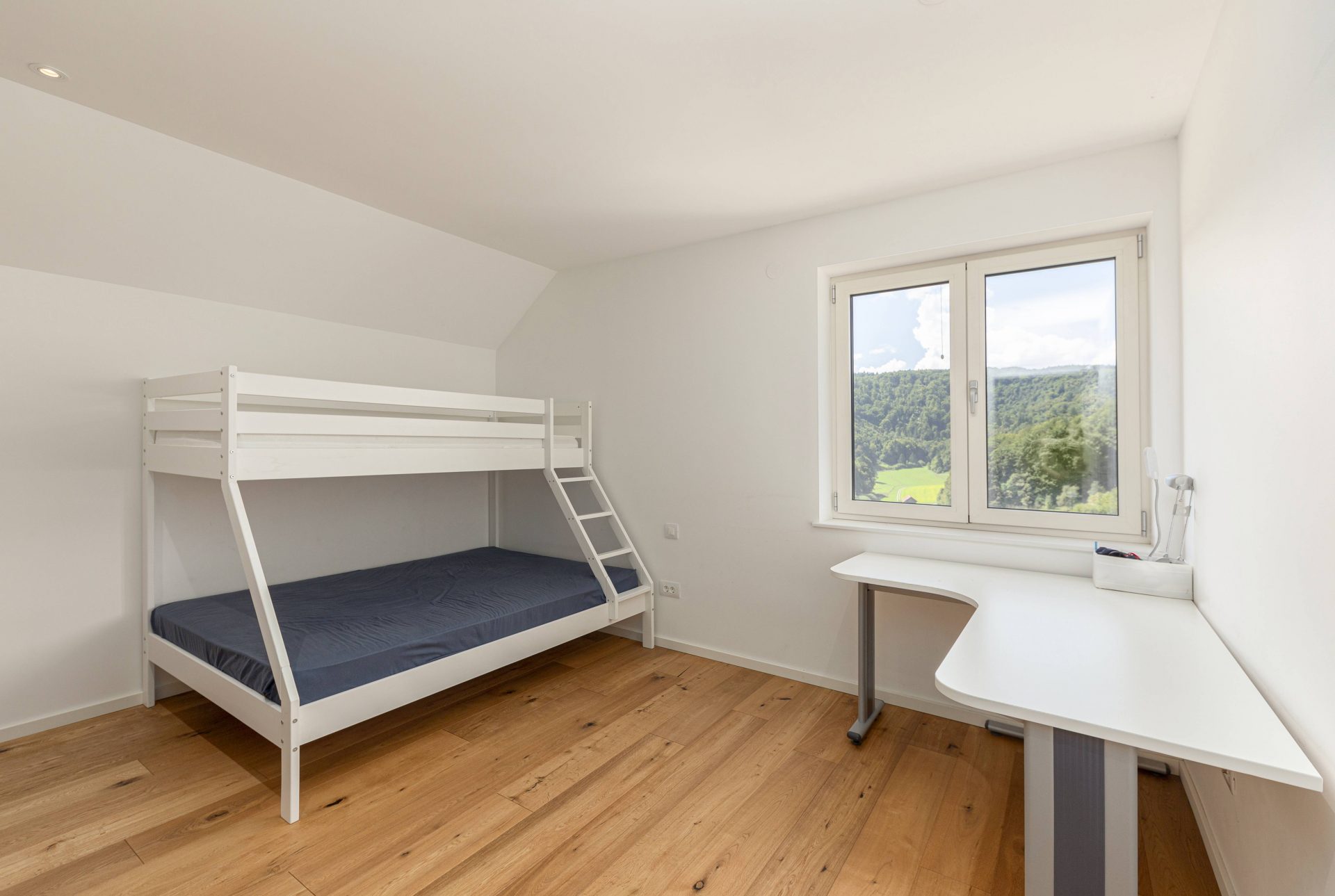 V zgornjem nadstropju sta dve otroški sobi, obe opremljeni s pogradi, pisalnimi mizami in omarami, ter nudita lep razgled na okoliške hribe. Poleg tega je tukaj prostor, ki trenutno služi kot telovadnica/pisarna, po želji pa se lahko preuredi v dodatno spalnico ali dnevni prostor. Nasproti telovadnice se nahaja kopalnica z dvojnim umivalnikom, kadjo in tušem. Na koncu hodnika drsna vrata vodijo v glavno spalnico, ki vključuje spalnico, lastno kopalnico s tušem ter veliko garderobno sobo. Spalnica ima neposreden izhod na zasebno teraso z jacuzzijem.