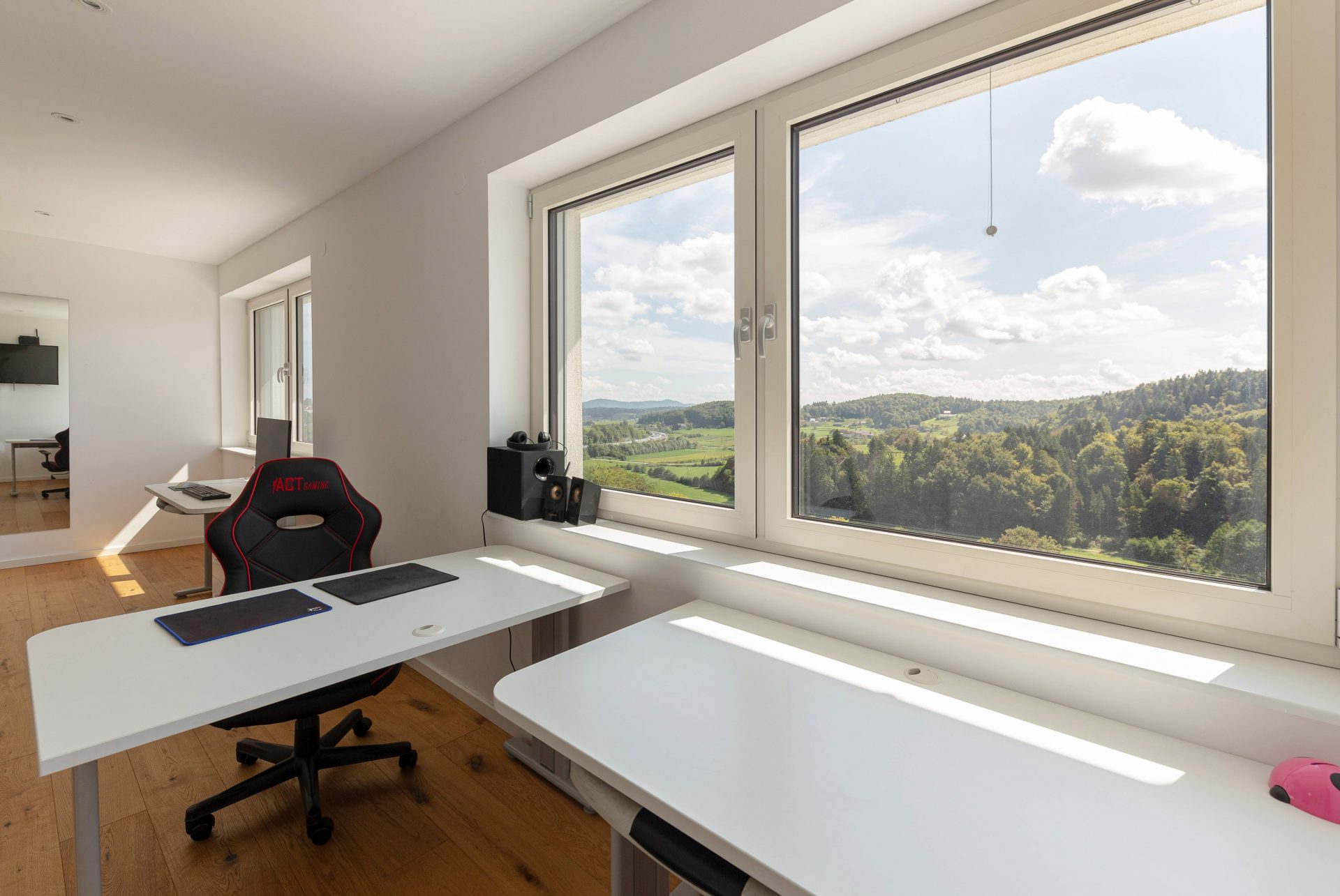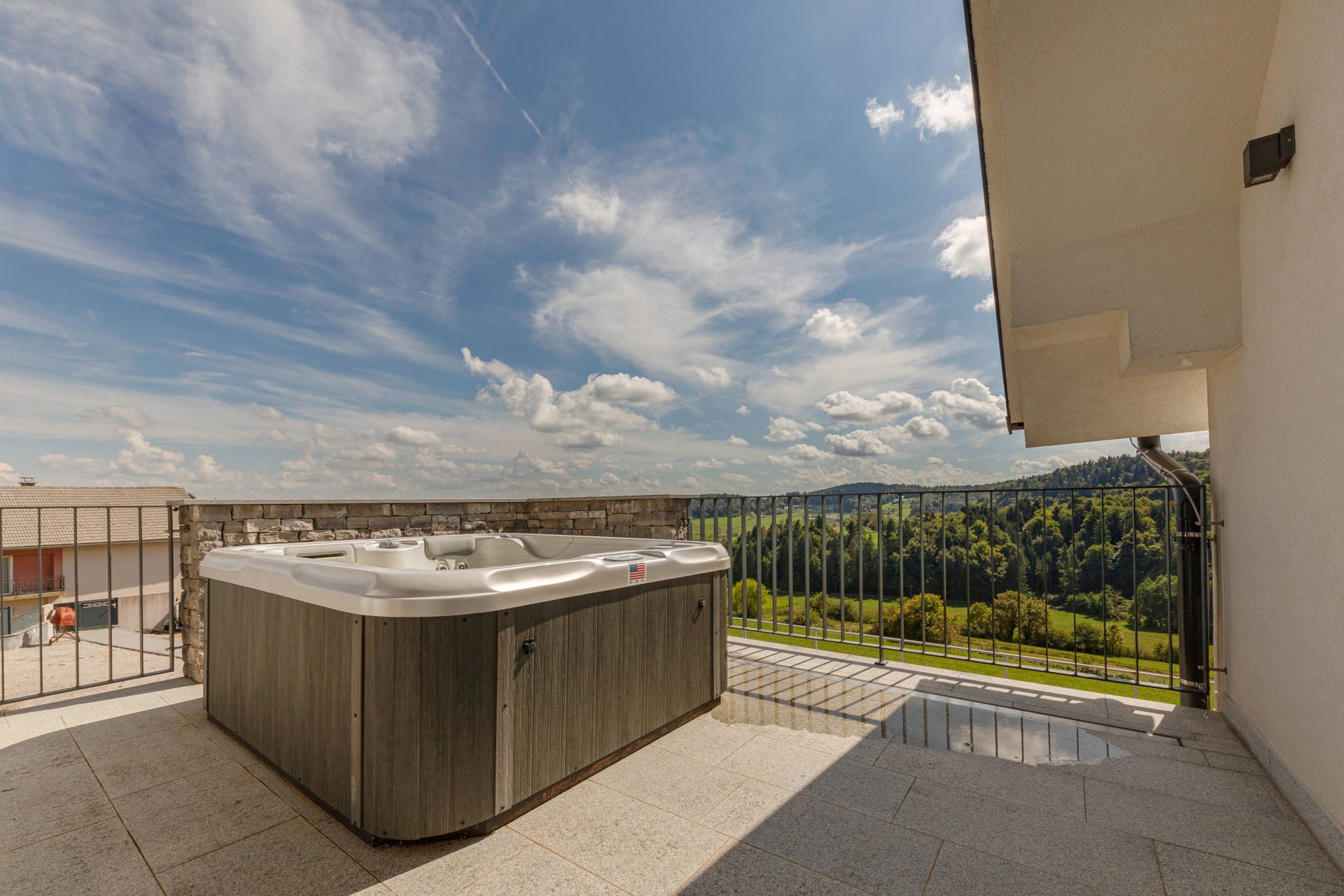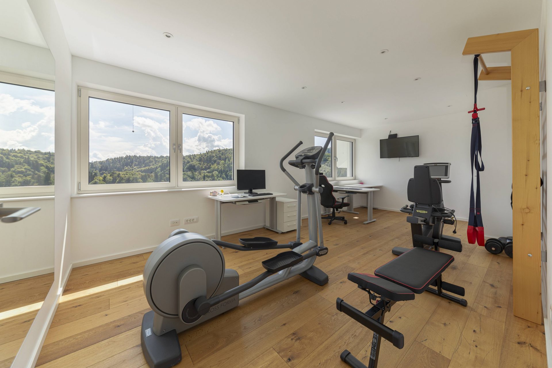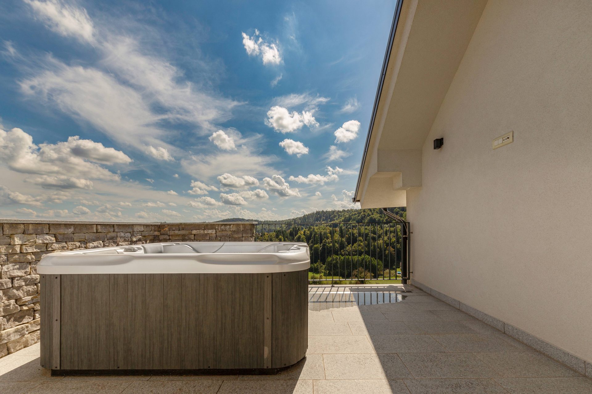 V zgornjem nadstropju sta dve otroški sobi, obe opremljeni s pogradi, pisalnimi mizami in omarami, ter nudita lep razgled na okoliške hribe. Poleg tega je tukaj prostor, ki trenutno služi kot telovadnica/pisarna, po želji pa se lahko preuredi v dodatno spalnico ali dnevni prostor. Nasproti telovadnice se nahaja kopalnica z dvojnim umivalnikom, kadjo in tušem. Na koncu hodnika drsna vrata vodijo v glavno spalnico, ki vključuje spalnico, lastno kopalnico s tušem ter veliko garderobno sobo. Spalnica ima neposreden izhod na zasebno teraso z jacuzzijem.