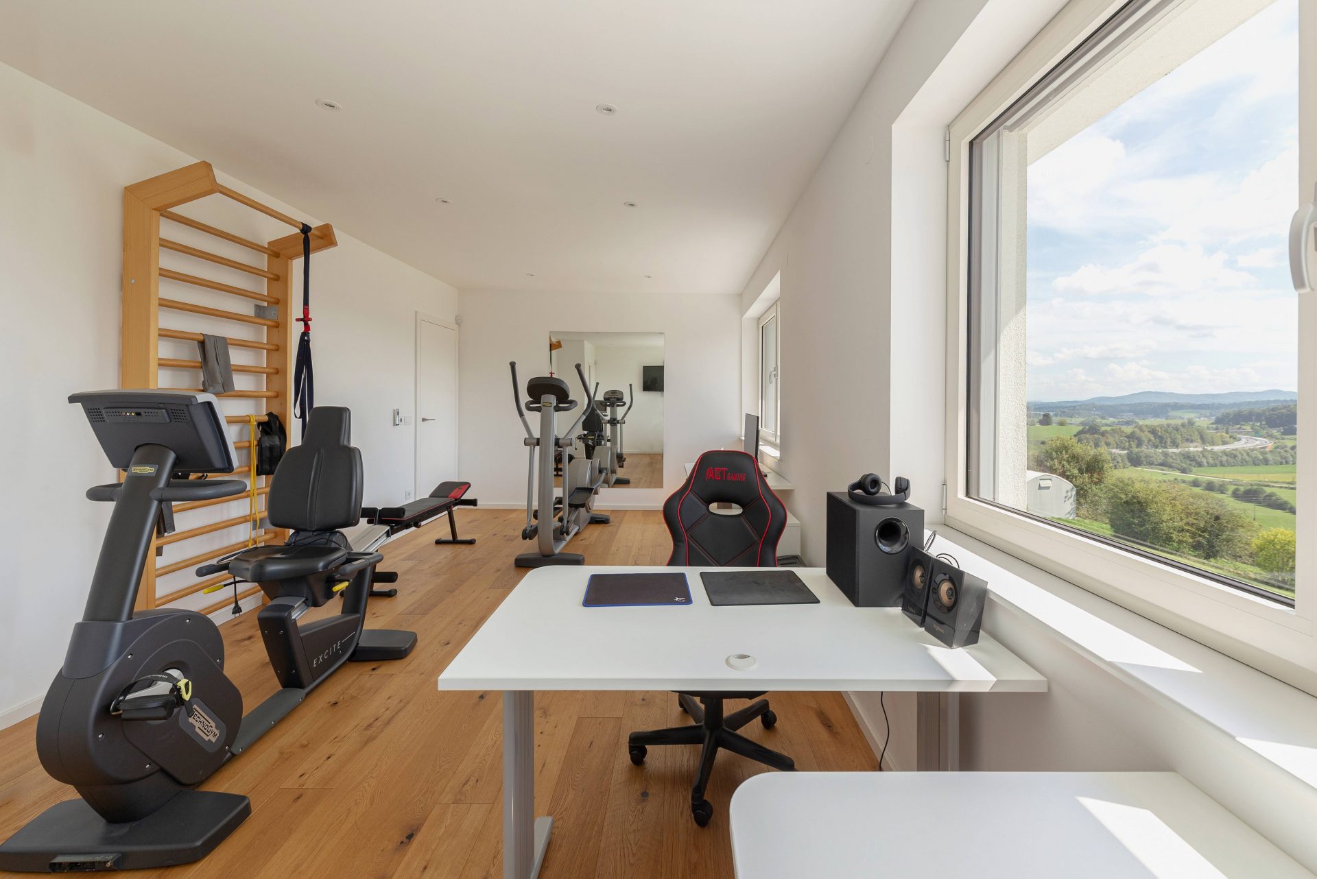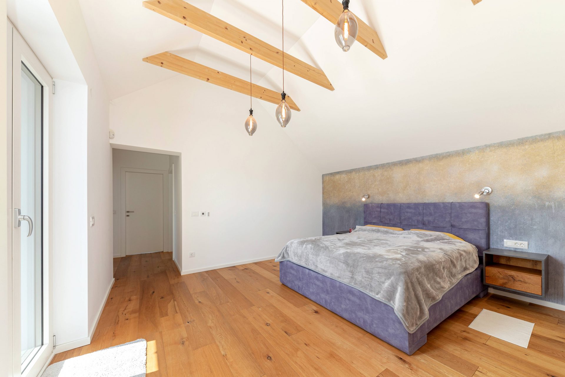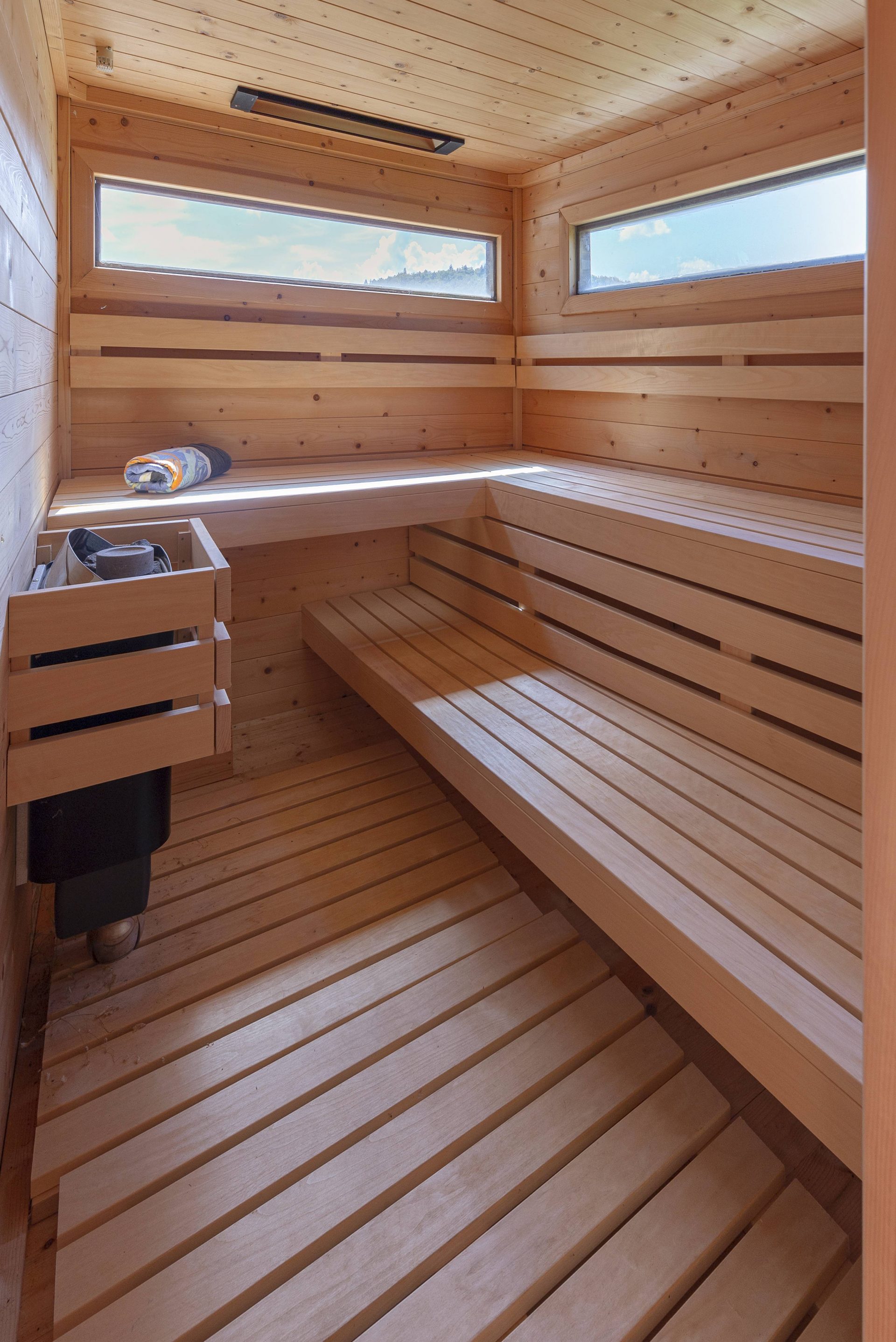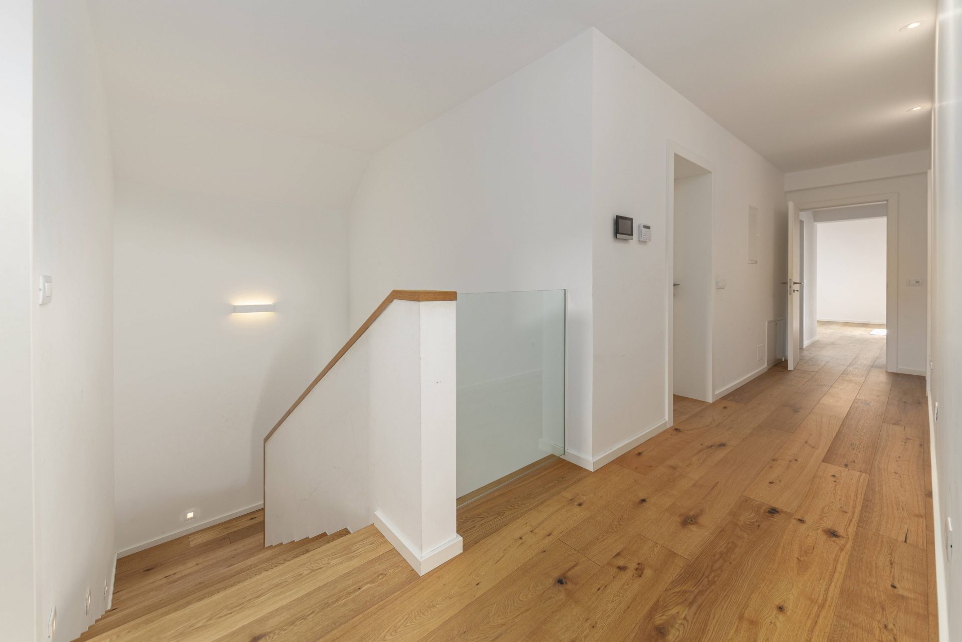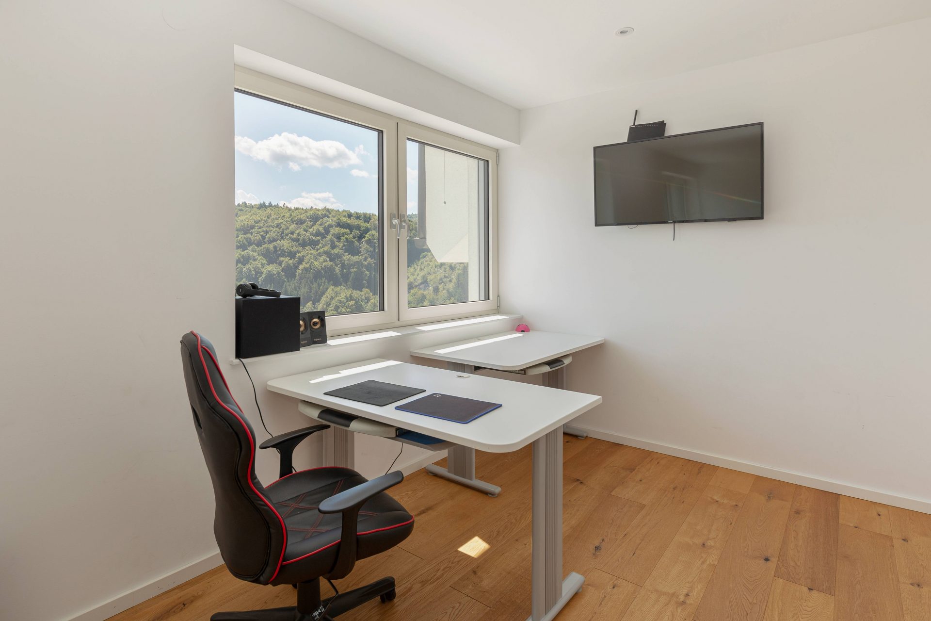 V zgornjem nadstropju sta dve otroški sobi, obe opremljeni s pogradi, pisalnimi mizami in omarami, ter nudita lep razgled na okoliške hribe. Poleg tega je tukaj prostor, ki trenutno služi kot telovadnica/pisarna, po želji pa se lahko preuredi v dodatno spalnico ali dnevni prostor. Nasproti telovadnice se nahaja kopalnica z dvojnim umivalnikom, kadjo in tušem. Na koncu hodnika drsna vrata vodijo v glavno spalnico, ki vključuje spalnico, lastno kopalnico s tušem ter veliko garderobno sobo. Spalnica ima neposreden izhod na zasebno teraso z jacuzzijem.