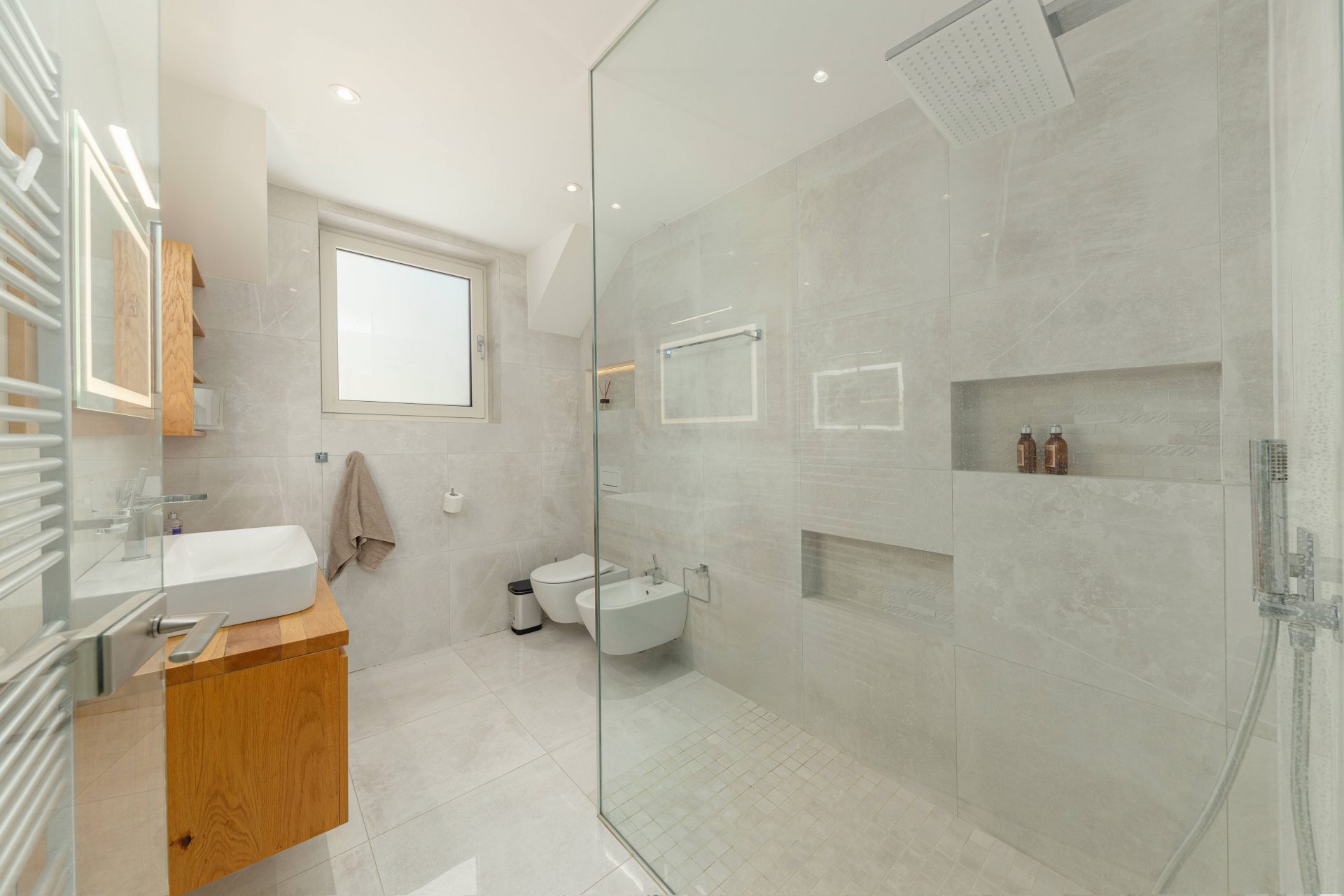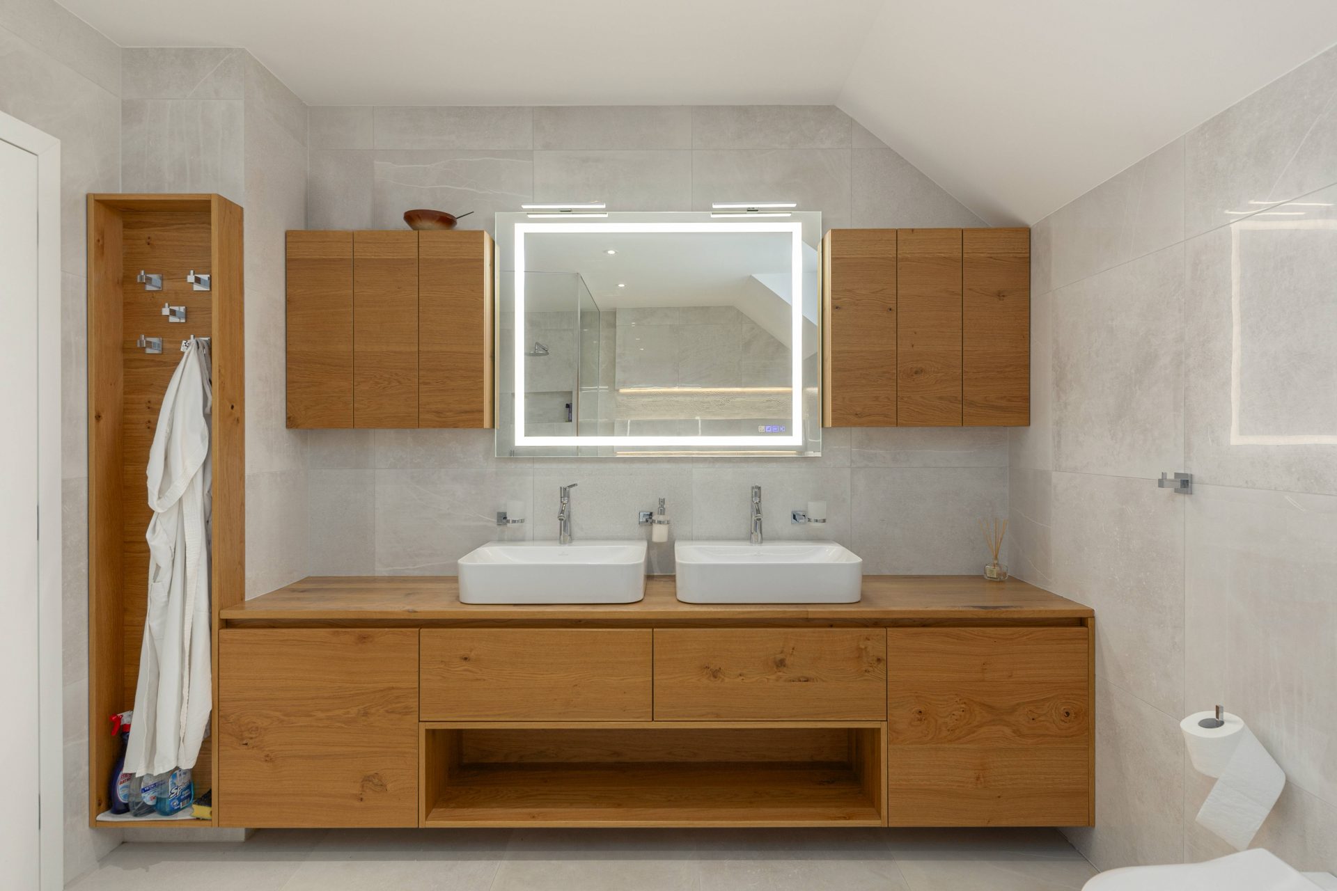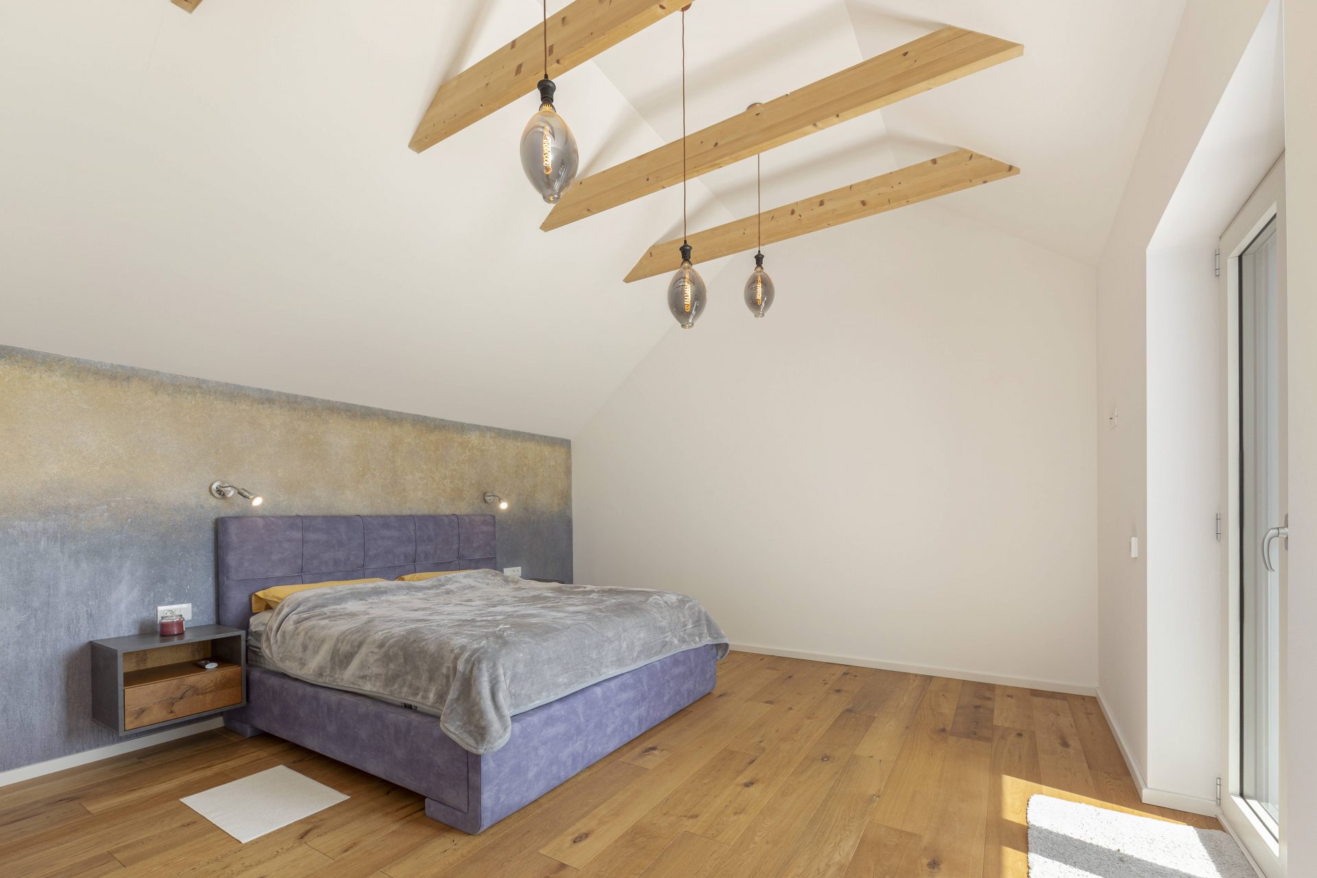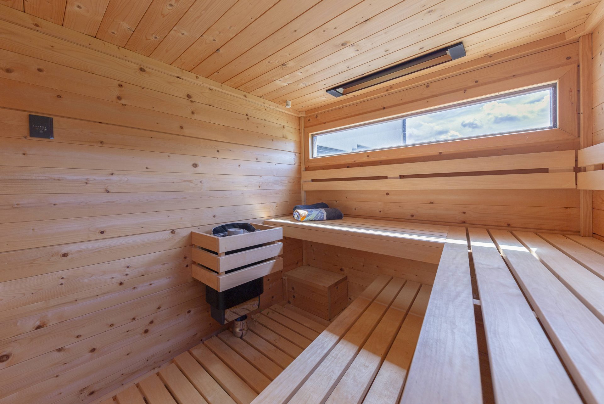 V zgornjem nadstropju sta dve otroški sobi, obe opremljeni s pogradi, pisalnimi mizami in omarami, ter nudita lep razgled na okoliške hribe. Poleg tega je tukaj prostor, ki trenutno služi kot telovadnica/pisarna, po želji pa se lahko preuredi v dodatno spalnico ali dnevni prostor. Nasproti telovadnice se nahaja kopalnica z dvojnim umivalnikom, kadjo in tušem. Na koncu hodnika drsna vrata vodijo v glavno spalnico, ki vključuje spalnico, lastno kopalnico s tušem ter veliko garderobno sobo. Spalnica ima neposreden izhod na zasebno teraso z jacuzzijem.