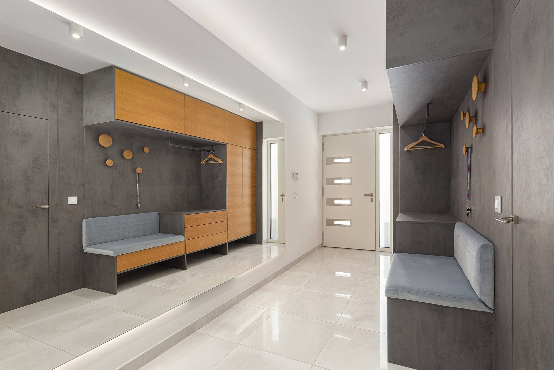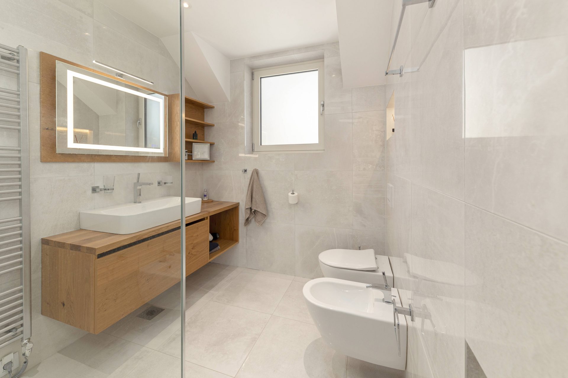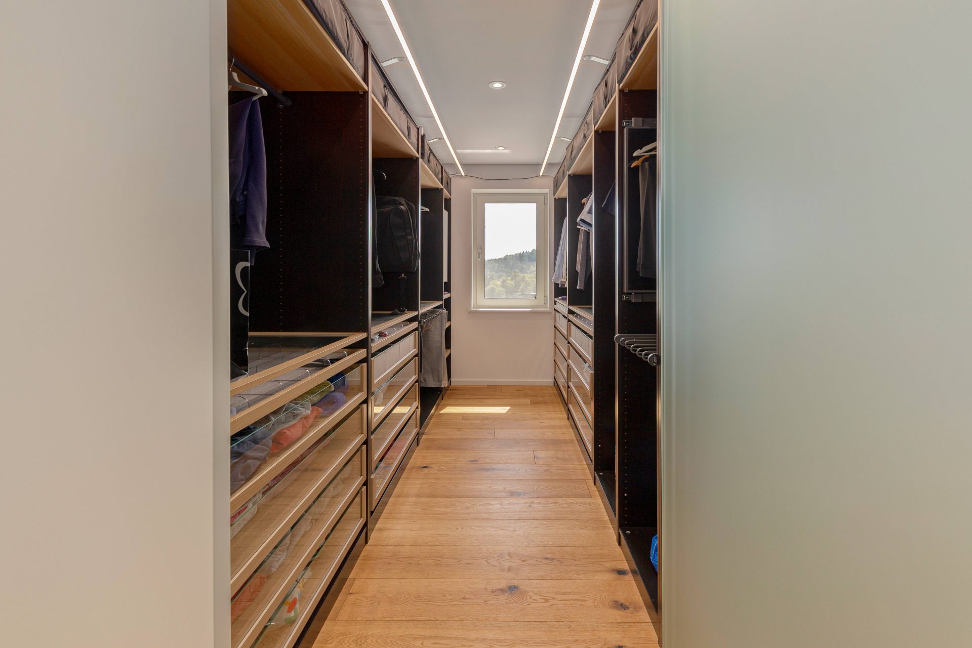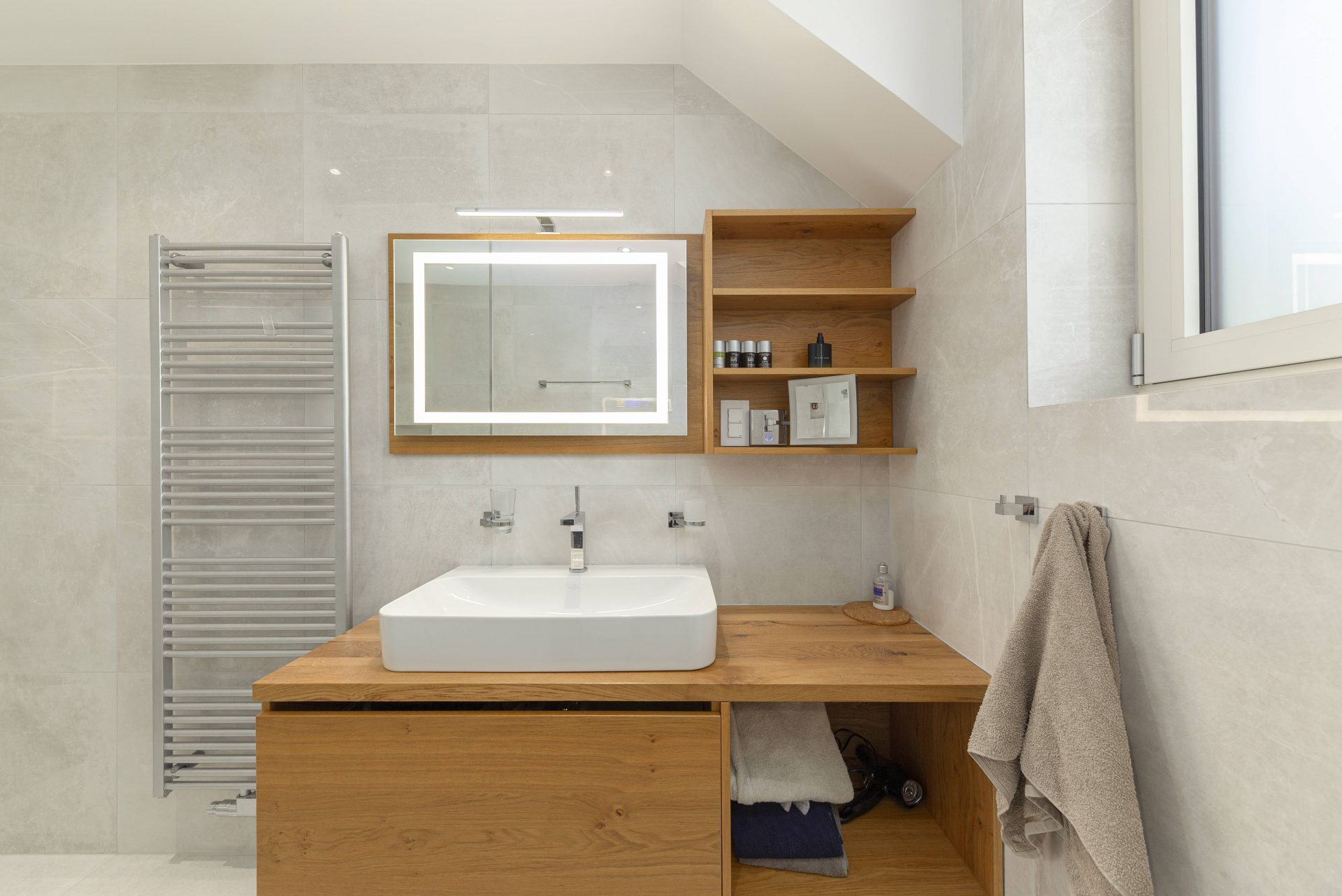 V zgornjem nadstropju sta dve otroški sobi, obe opremljeni s pogradi, pisalnimi mizami in omarami, ter nudita lep razgled na okoliške hribe. Poleg tega je tukaj prostor, ki trenutno služi kot telovadnica/pisarna, po želji pa se lahko preuredi v dodatno spalnico ali dnevni prostor. Nasproti telovadnice se nahaja kopalnica z dvojnim umivalnikom, kadjo in tušem. Na koncu hodnika drsna vrata vodijo v glavno spalnico, ki vključuje spalnico, lastno kopalnico s tušem ter veliko garderobno sobo. Spalnica ima neposreden izhod na zasebno teraso z jacuzzijem.