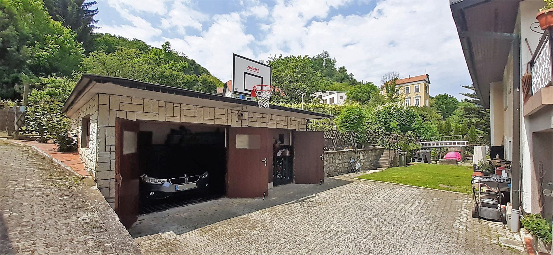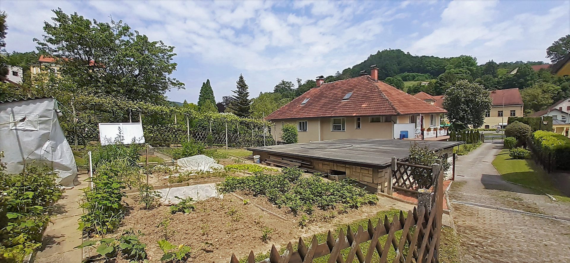Pred hišo je lep, urejen vrt zasajen z okrasnimi rastlinami. Za hišo se nahaja garaža za dva avtomobila in velik zelenjavni vrt. Možnost parkiranja dodatnih vozil na dvorišču.