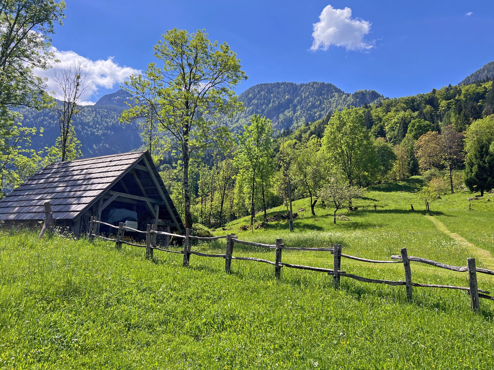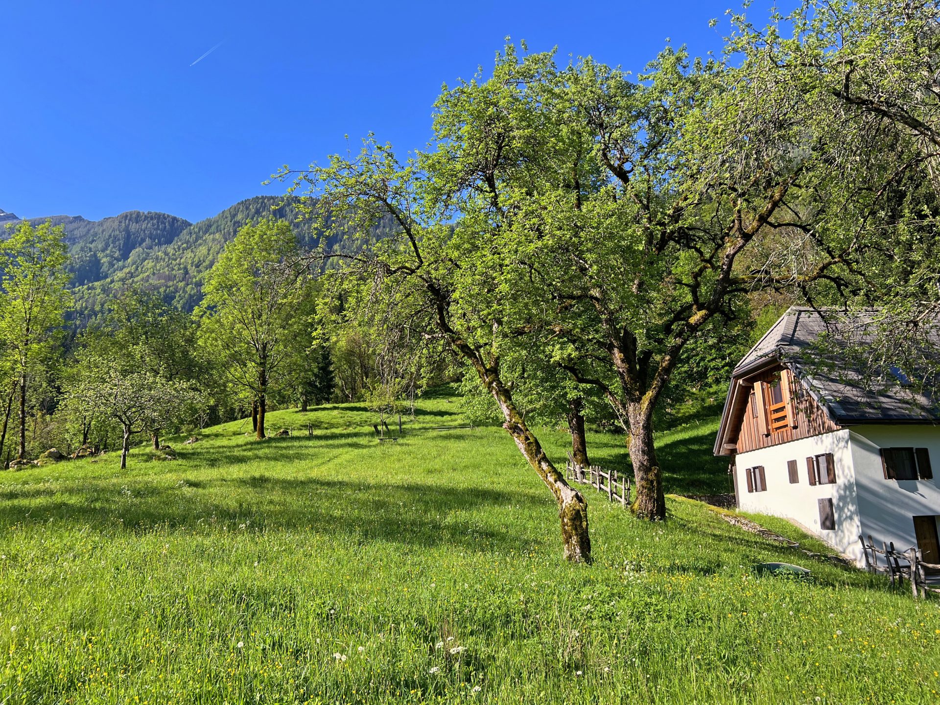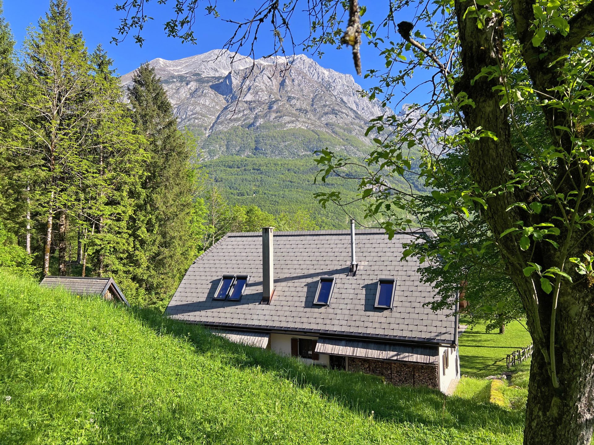 Edinstvena hiša s 3 spalnicami v osrčju doline Soče se nahaja na izjemni lokaciji, brez neposrednih sosedov, obdana s travniki, hribi in gorami.